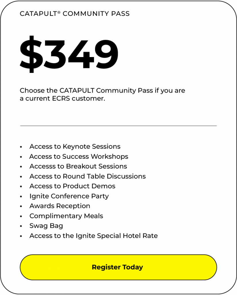 Experience Ignite in Nashville this August! Witness CATAPULT’s power and a collaborative community firsthand. Innovate together, gain insights, and explore solutions to transform your business. Ready to be part of something extraordinary?